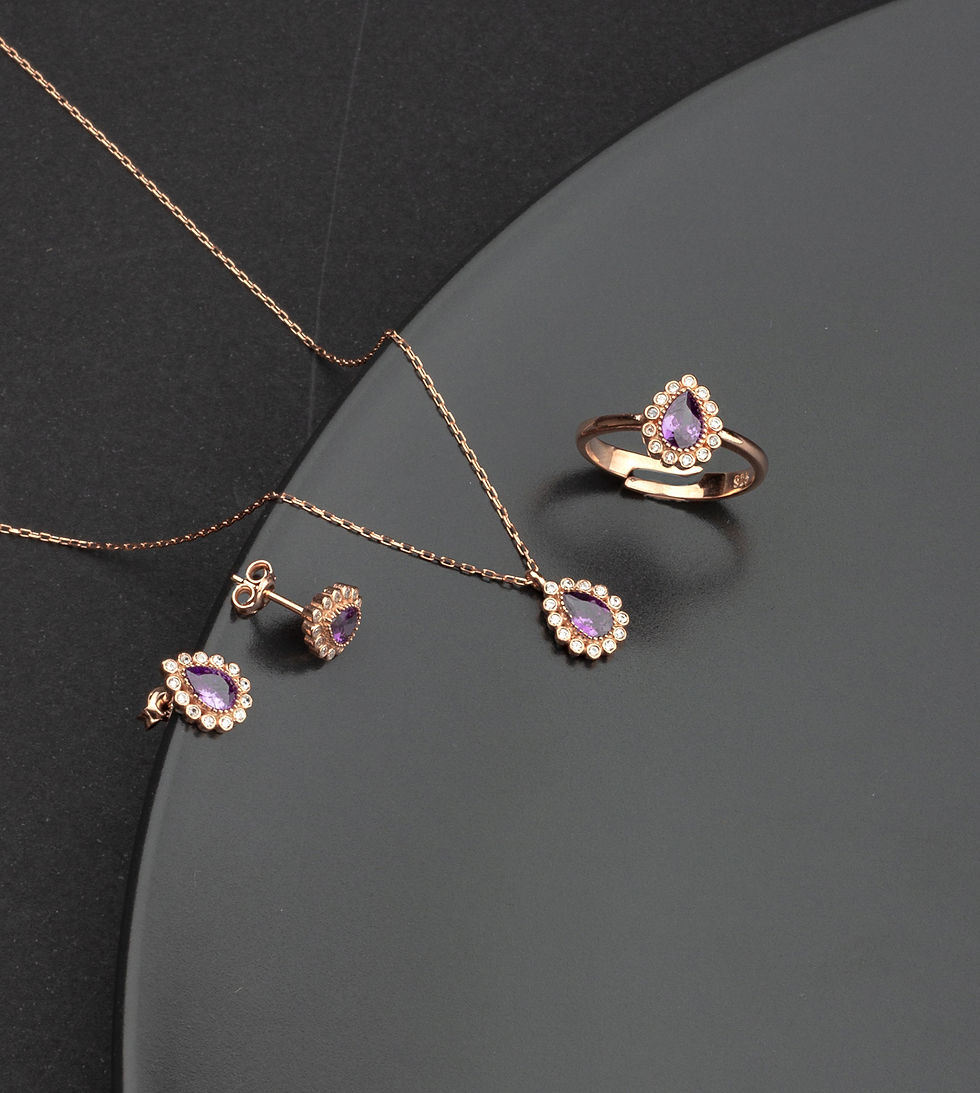 925 Ayar Gümüş Ametist Renkli Damla Model Kolye Küpe Yüzük Takı Seti
